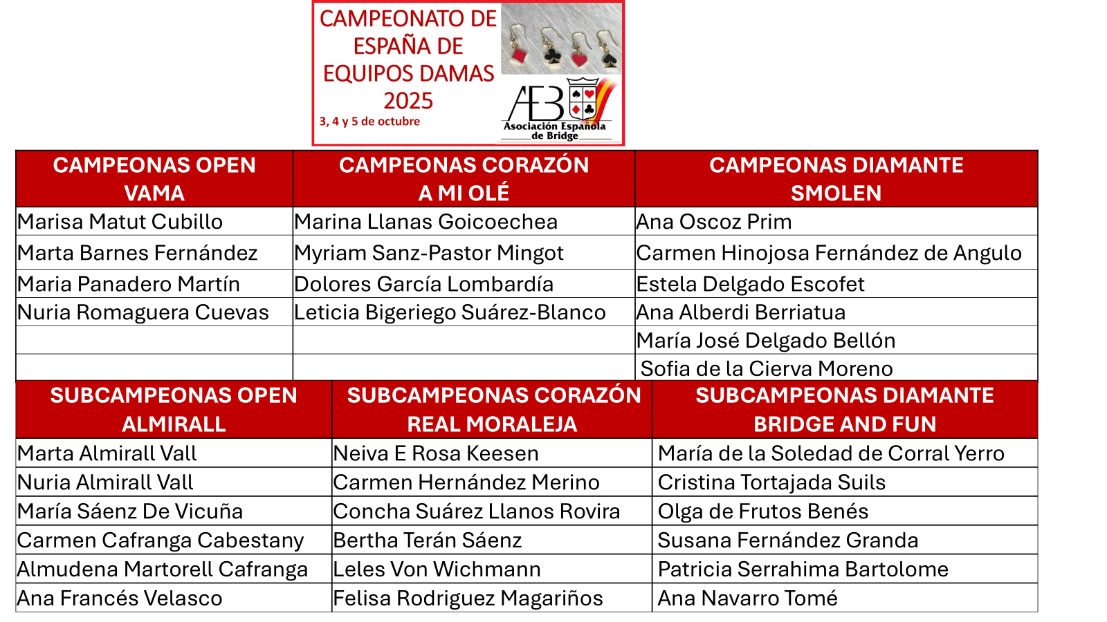 Torneos Equipos Oficiales AEB Sep 16 CAMPEONATO DE ESPAÑA DE EQUIPOS DAMAS 2025 DAMAS OPEN DAMAS CORAZÓN/DIAMANTE carrusel Artículos relacionados XII OPEN DE GALICIA Sep 22 LXVIII Open de Parejas de la ACB Sep 19 Gran Premio Open de Bridge Villa de Madrid Sep 05 9ª LIGA AEB ONLINE Jul 30 NUEVA PROGRAMACIÓN TORNEOS FUNBRIDGE Oct 11