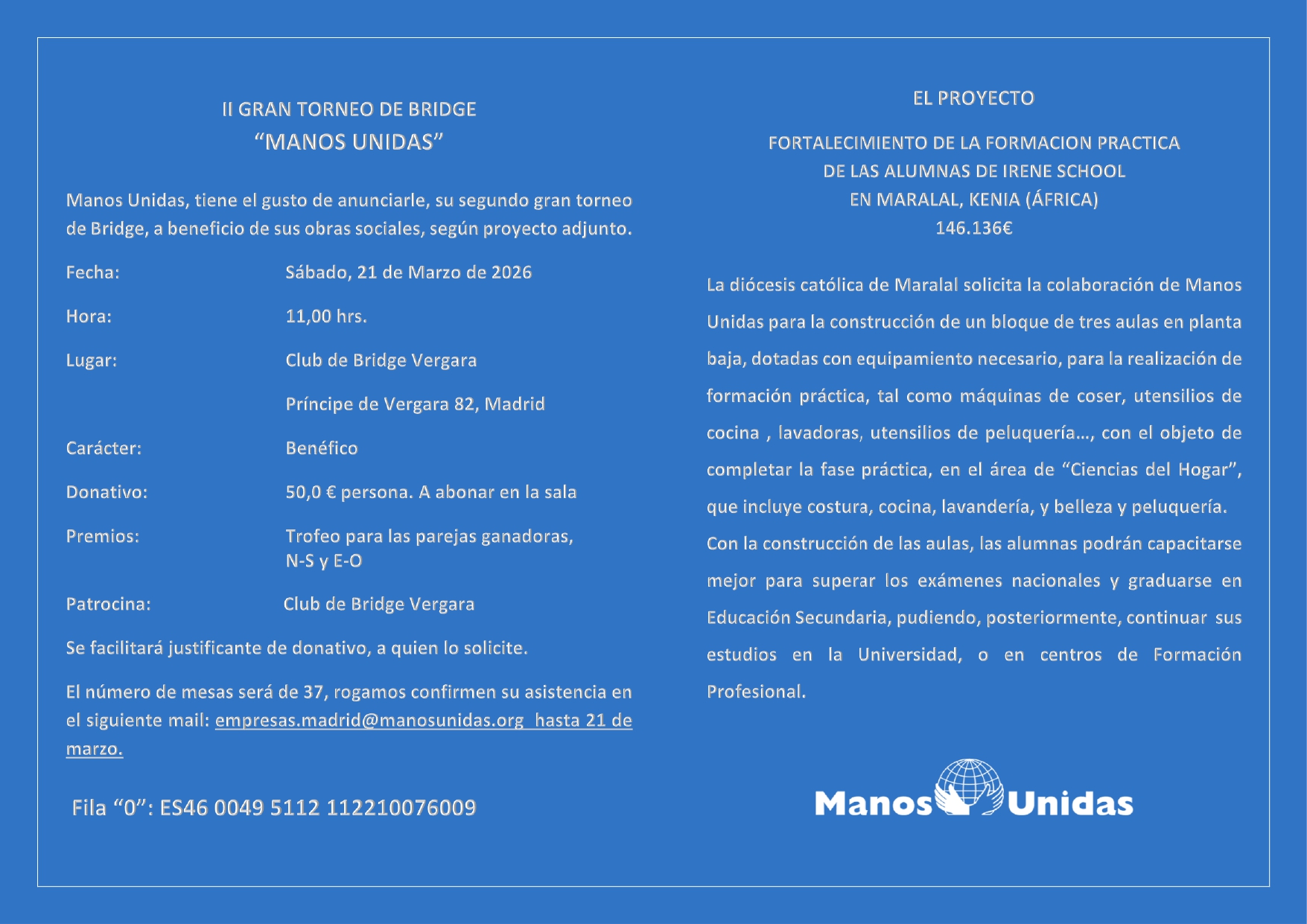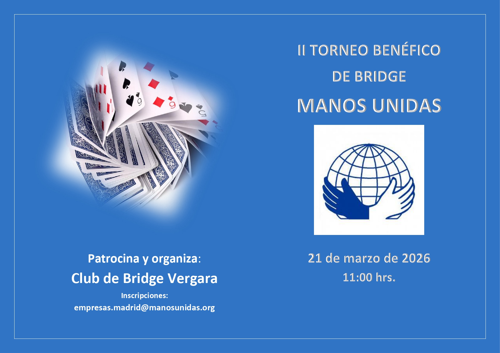 Torneos Madrileña N/A Feb 23 Torneo Benéfico Manos Unidas carrusel Artículos relacionados Torneo Benéfico Bridge CONTIGO Feb 24 CAMPEONATO DE ESPAÑA DE EQUIPOS SENIOR 2026 Feb 11 10ª LIGA Jan 22 NUEVA PROGRAMACIÓN TORNEOS FUNBRIDGE Oct 11