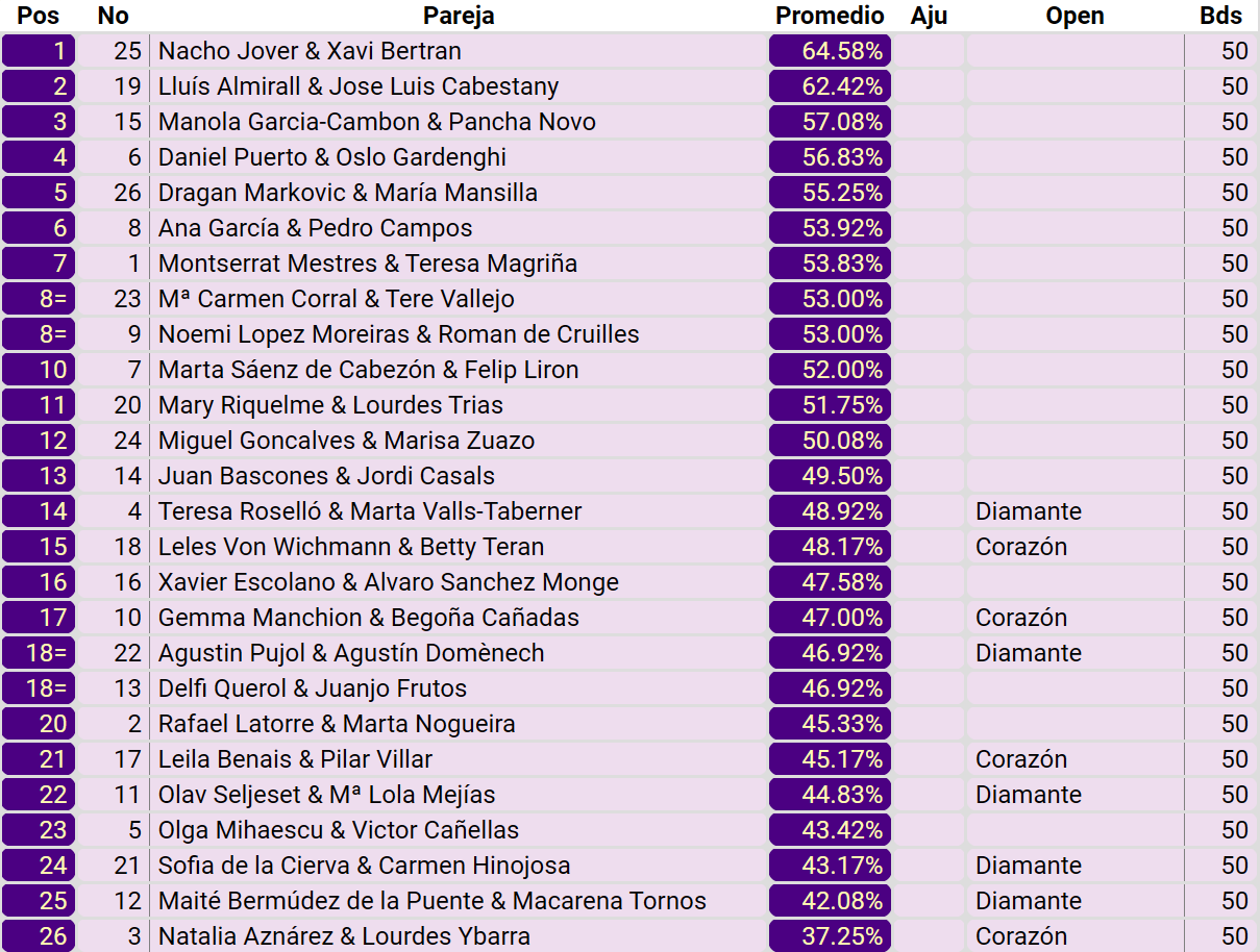 I Torneo Nacional de Otoño ACB 06/09/2025 - 07/09/2025 Ciudad: RealBridge Club Torneos jugados fuera de club Programa Comite Apelacion Starting List - Sesión 1 Manos - Sesión 1 Clasificacion - Sesión 1 Manos - Sesión 2 Clasificación Final